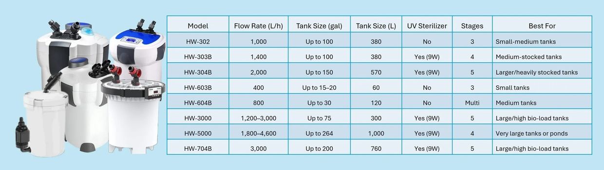 Tank Size & Stocking Density: Choose a filter with a flow rate ~4–5× your tank volume.